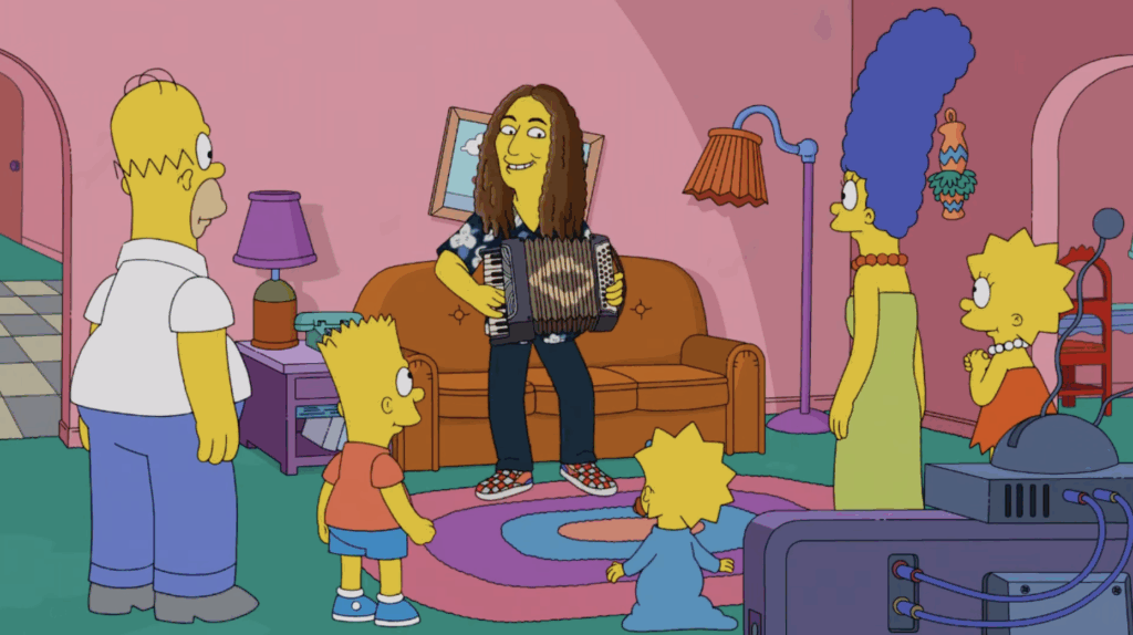 Yes, Weird Al had two spots on The Simpsons. The first was on the Season 14 staple ‘Three Gays of the Condo,’ when Marge hires Yankovic to write a song that will convince Homer to come home, set to the tune of a John Mellancamp song–wasn’t that nice of him? The second was in a Season 34 couch gag, where Al greets the Simpsons Family with an accordion in hand.
