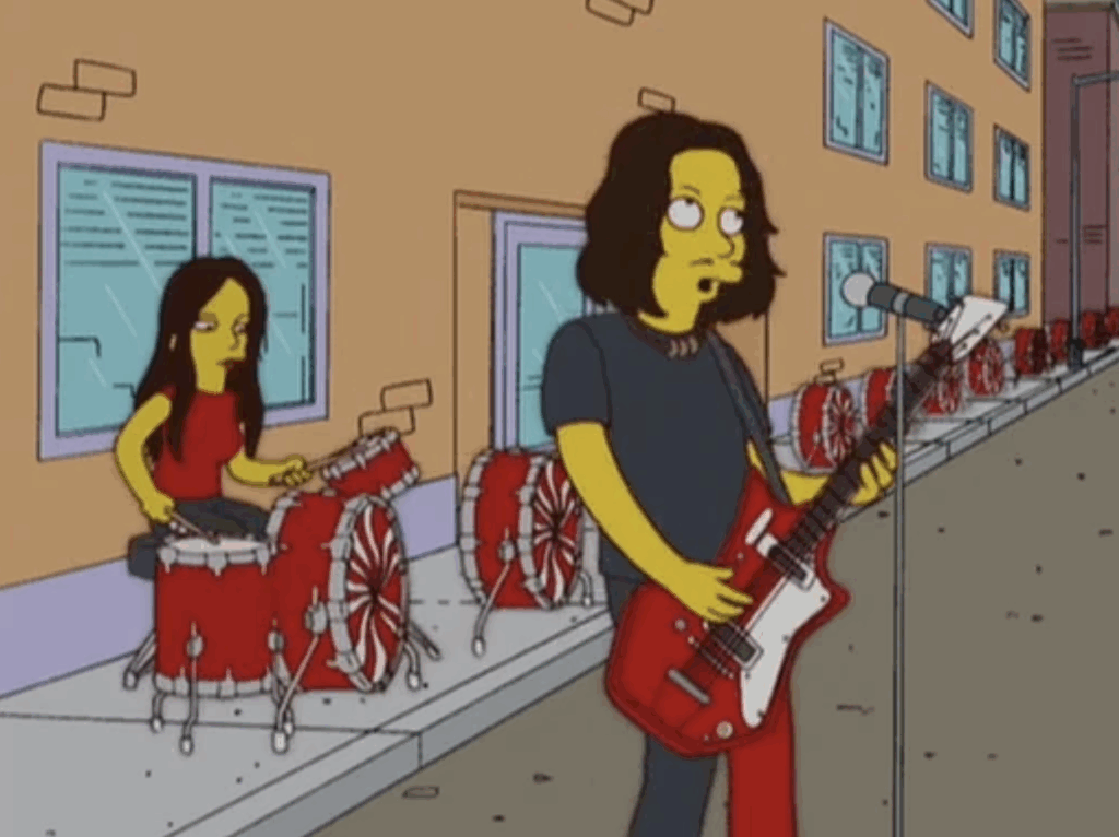 Back when The White Stripes was one of alternative rock’s hottest commodities, Jack and Meg White stopped by The Simpsons just long enough to intersect with Bart’s storyline where he takes up the drums.