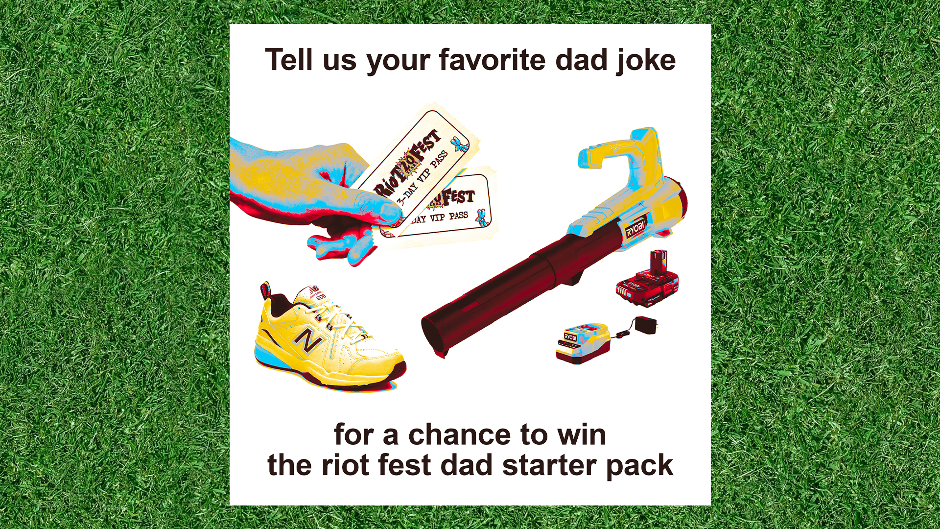 Tell us your favorite dad joke for a chance to win the Riot Fest Dad Starter Pack: A pair of 3-Day VIP Tickets, leaf blower, and a pair of New Balance shoes.
