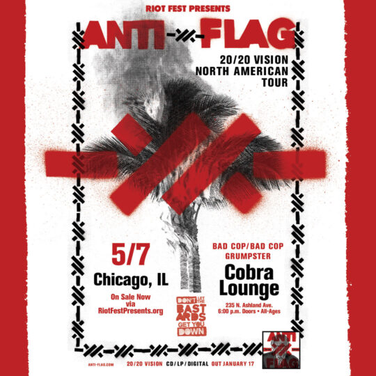 Thu May 7 2020 6:00PM Doors at 6:00 p.m.All Ages Riot Fest Presents: Postponed: Anti-FlagPostponed: Anti-Flag Cobra Lounge Chicago, IL Tickets RSVP Share https://riotfest.org/event/anti-flag/