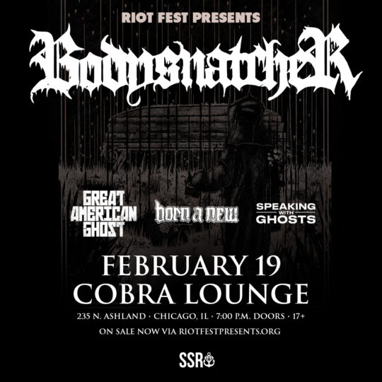 Wed Feb 19 2020 7:00PM Doors at 7:00 p.m.17+ Riot Fest Presents: BodysnatcherBodysnatcher Cobra Lounge 235 N. Ashland Ave. • Chicago, IL Tickets RSVP Share https://riotfest.org/event/bodysnatcher/