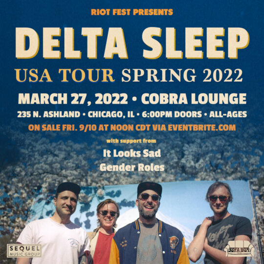 Sun Mar 27 2022 6:00PM Doors open at 6:00pm / All Ages Riot Fest Presents: Delta SleepDelta Sleep Cobra Lounge 235 N. Ashland Ave • Chicago, IL Sold Out RSVP Share https://riotfest.org/event/delta-sleep/