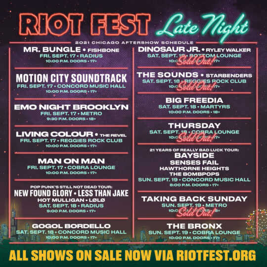 Fri Aug 20 2021 12:00AM Doors open at 9:30pm / 18+ Riot Fest Presents: Emo Night BrooklynEmo Night Brooklyn Metro Chicago, IL Tickets Share https://riotfest.org/event/emo-night-brooklyn-3/