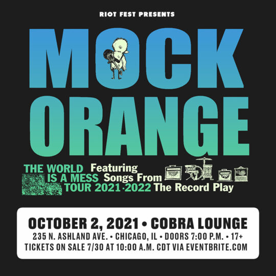 Sat Oct 2 2021 7:00PM Doors at 7:00 p.m.17+ Riot Fest Presents: Mock OrangeMock Orange Cobra Lounge 235 N. Ashland Ave. • Chicago, IL Tickets RSVP Share https://riotfest.org/event/mock-orange/