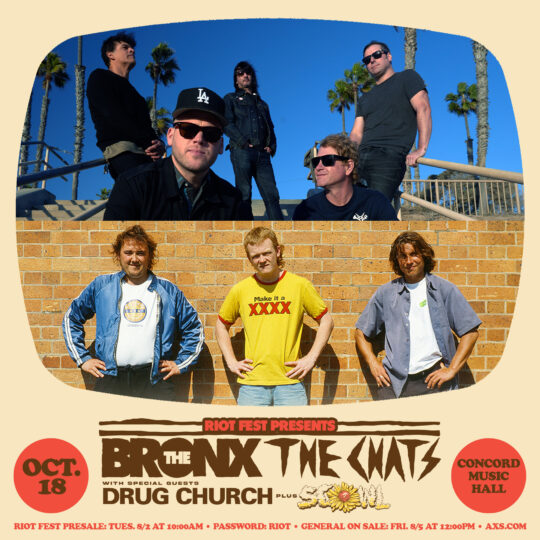 Tue Oct 18 2022 6:00PM Doors at 6:00 p.m. / 17+ Riot Fest Presents: The Bronx + The ChatsThe Bronx + The ChatsDrug ChurchScowl Concord Music Hall 2047 N Milwaukee Ave. • Chicago, IL Tickets RSVP Share https://riotfest.org/event/the-bronx-the-chats/Listen to The Bronx Listen to The Chats Action / Adventure – “Poser”Listen to Drug Church Drug Church – Million Miles of FunListen to Scowl Scowl – BloodhoundOther upcoming shows you should see… (If you’re cool)