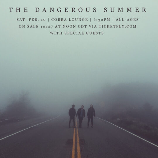 Sat Feb 10 2018 7:30PM Doors at 6:30pm / All Ages Riot Fest Presents: SOLD OUT – The Dangerous SummerSOLD OUT – The Dangerous Summer Cobra Lounge 235 N. Ashland Ave • Chicago, IL Tickets Share https://riotfest.org/event/the-dangerous-summer/Riot Fest PresentsThe Dangerous Summerwith Microwave and The Band Camino Saturday, February 10thCobra Lounge235 N Ashland AveDoors 6:30 PM Show 7:30 PM