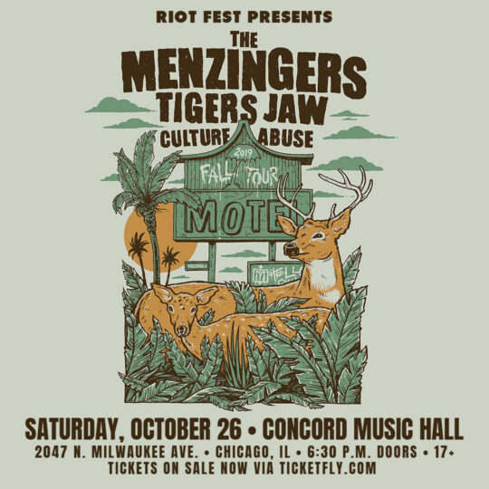 Sat Oct 26 2019 6:30PM Doors at 6:30 p.m.17+ Riot Fest Presents: The MenzingersThe Menzingers Concord Music Hall 2047 N Milwaukee Ave • Chicago, IL Tickets RSVP Share https://riotfest.org/event/the-menzingers-2/