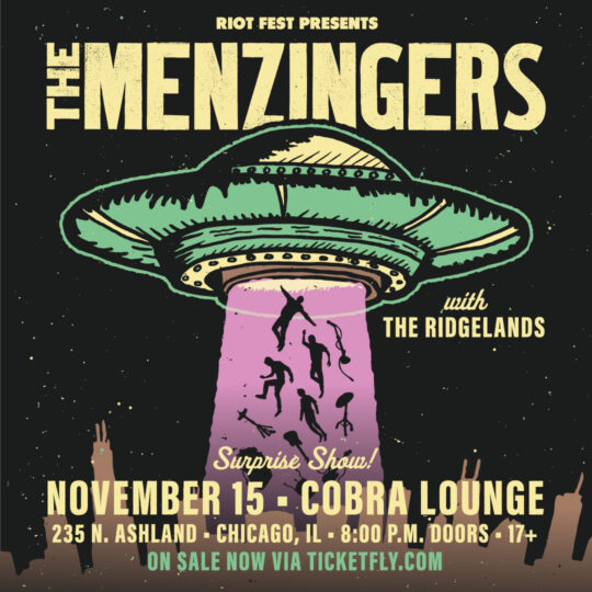 Thu Nov 15 2018 9:00PM Doors at 8:00 p.m.17+ Riot Fest Presents: The MenzingersThe Menzingers Cobra Lounge 235 N. Ashland • Chicago, IL Tickets Share https://riotfest.org/event/the-menzingers/Doors at 8:00 p.m. Show at 9:00 p.m.
