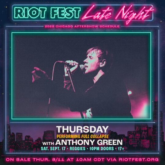 Sat Sep 17 2022 10:00PM Doors at 10:00 p.m. / 17+ Riot Fest Presents: Thursday (Performing Full Collapse)Thursday (Performing Full Collapse)Anthony Green Reggies 2105 S State St • Chicago, IL Sold Out Share https://riotfest.org/event/thursday-performing-full-collapse/