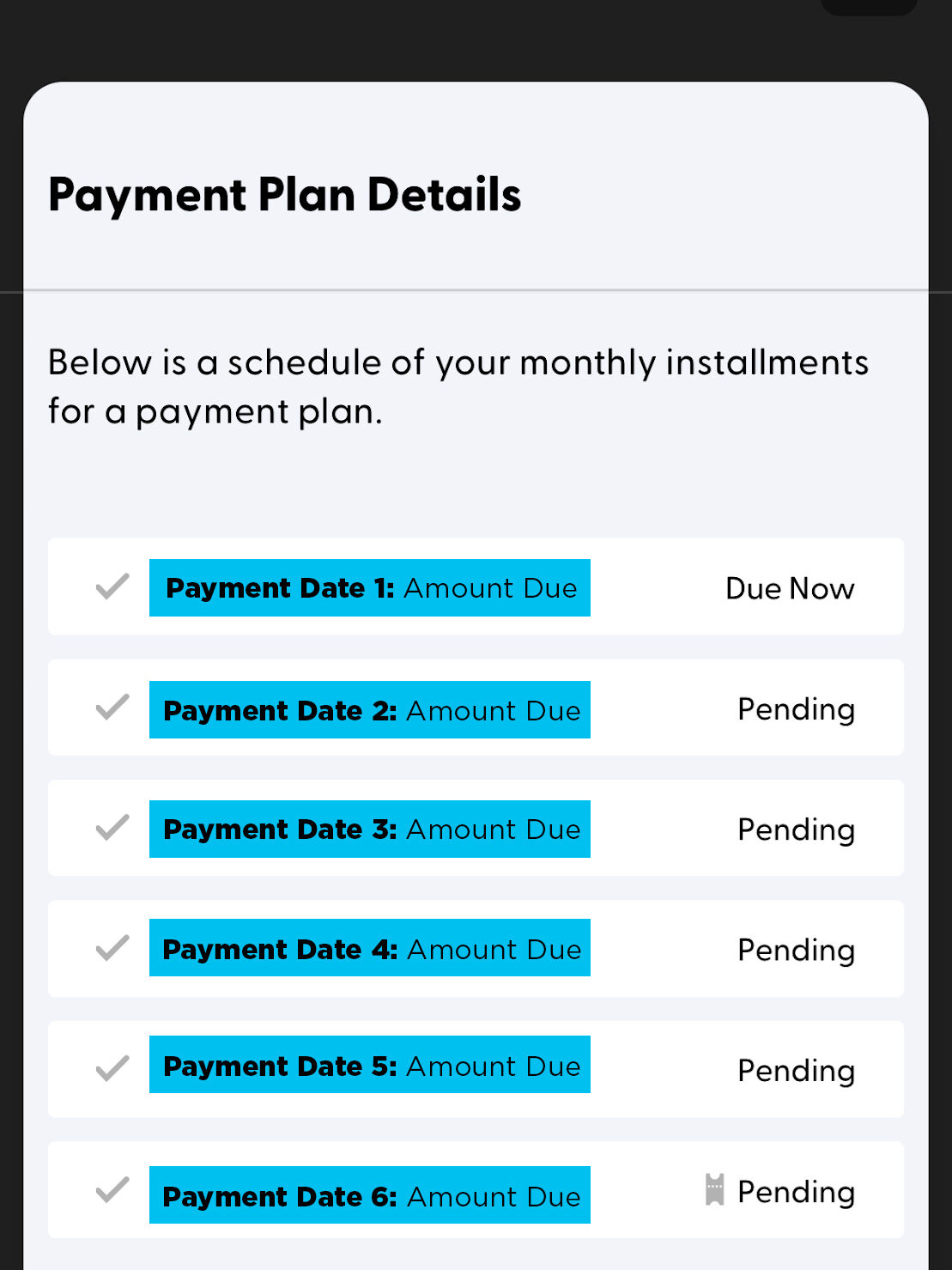 - Click on the blue “Payment Plan Active” hyperlink, which will expand your payment plan details